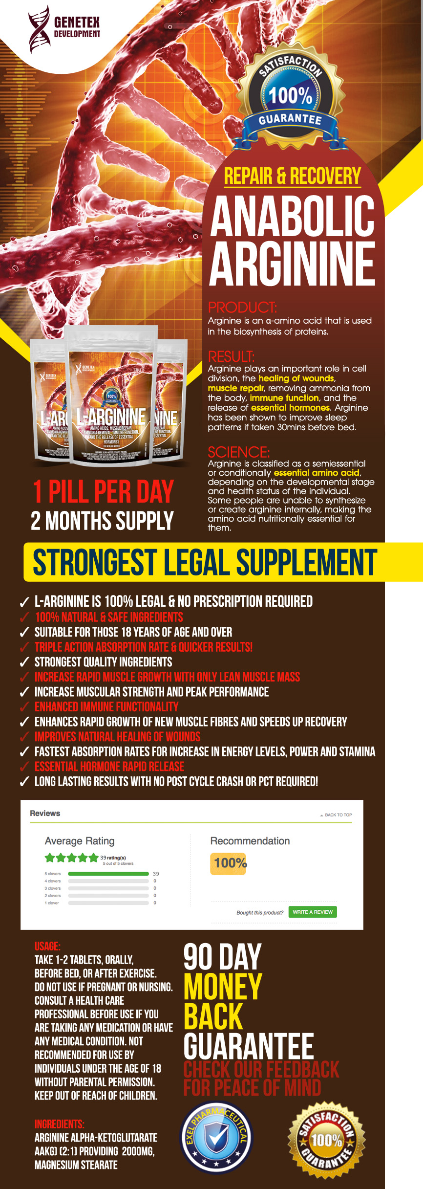 Result: Arginine plays an important role in cell division, the healing of wounds, muscle repair, removing ammonia from the body, immune function, and the release of essential hormones. Arginine has been shown to improve sleep patterns if taken 30mins before bed.