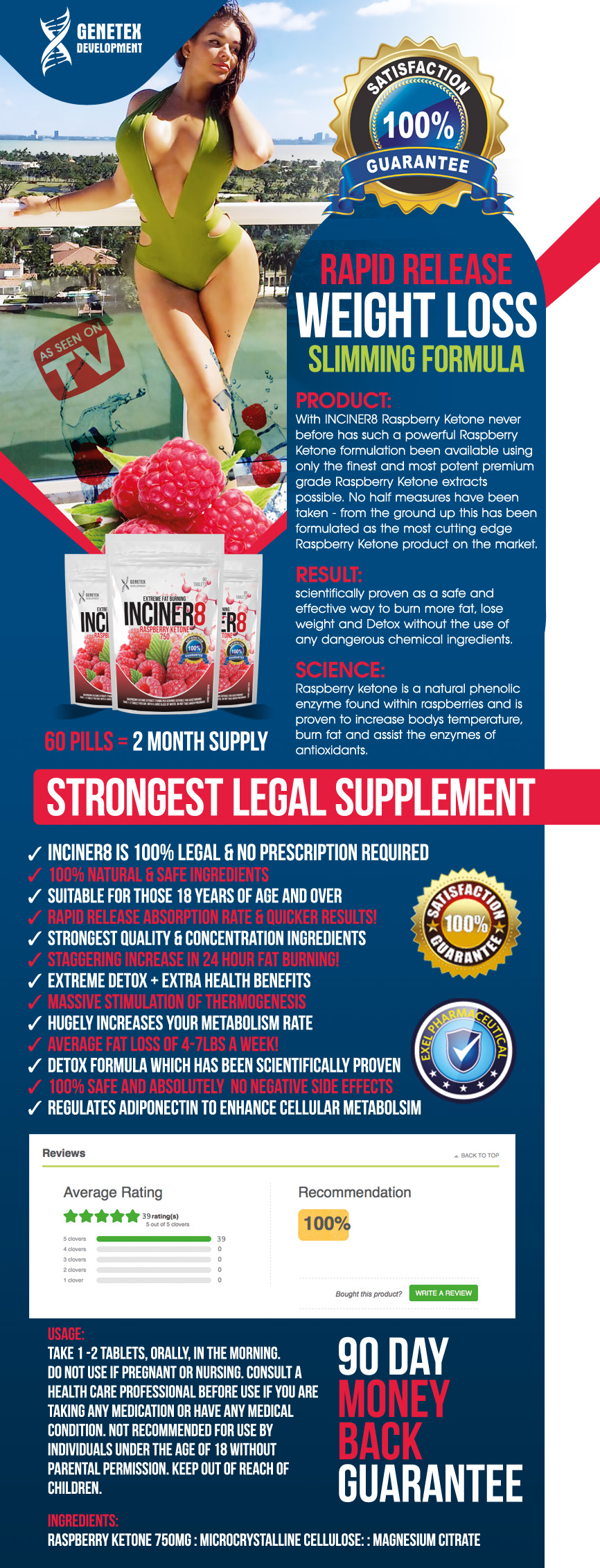 Product: with Inciner8 Raspberry Ketone never before has such a powerful raspberry Ketone formulation been available using only the finest and most patent premium grade Raspberry Ketone extracts possible. No half measures have been taken – from the ground up this has been formulated as the most cutting edge raspberry Ketone product on the market.